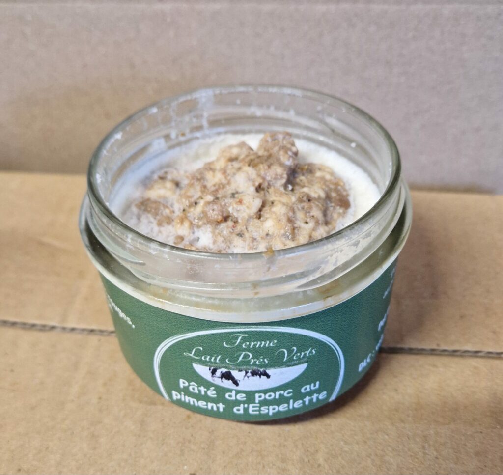 Viande issue de nos cochons élevés sur paille et nourris au petit lait de nos fromages. Nous relevons légèrement ce pâté avec du piment d’Espelette.